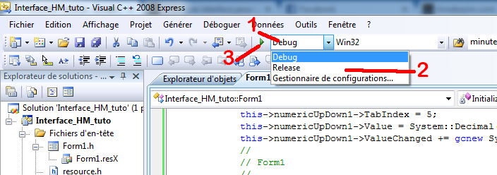 Voilà pour l'interface graphique sous Visual C++. Avant de passer sur l'Arduino, dans la barre d'outils, cliquez sur la liste déroulante « Debug » (à gauche de la flèche verte) et sélectionnez « Release » et pour finir, cliquer sur la flèche verte. Une fois cela fait, s'il n'y a pas d'erreurs, vous devriez avoir dans le répertoire de votre projet un dossier nommé « Release ». Ouvrez-le et copiez le fichier qu'il contient sur votre bureau : c'est l'exécutable final de votre application.