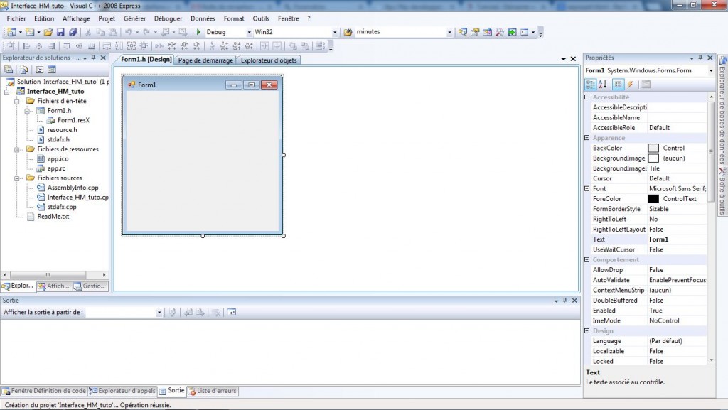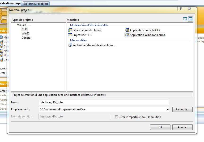 Ouvrez Visual C++ et aller dans « Fichier > Nouveau projet » pour ouvrir la fenêtre de création de nouveau projet. Ensuite, sélectionner « Application Windows Forms » dans la liste « CLR », donnez un nom à votre projet, sélectionnez le répertoire où vous voulez l'enregistrer et enfin, cliquez sur « OK ».
