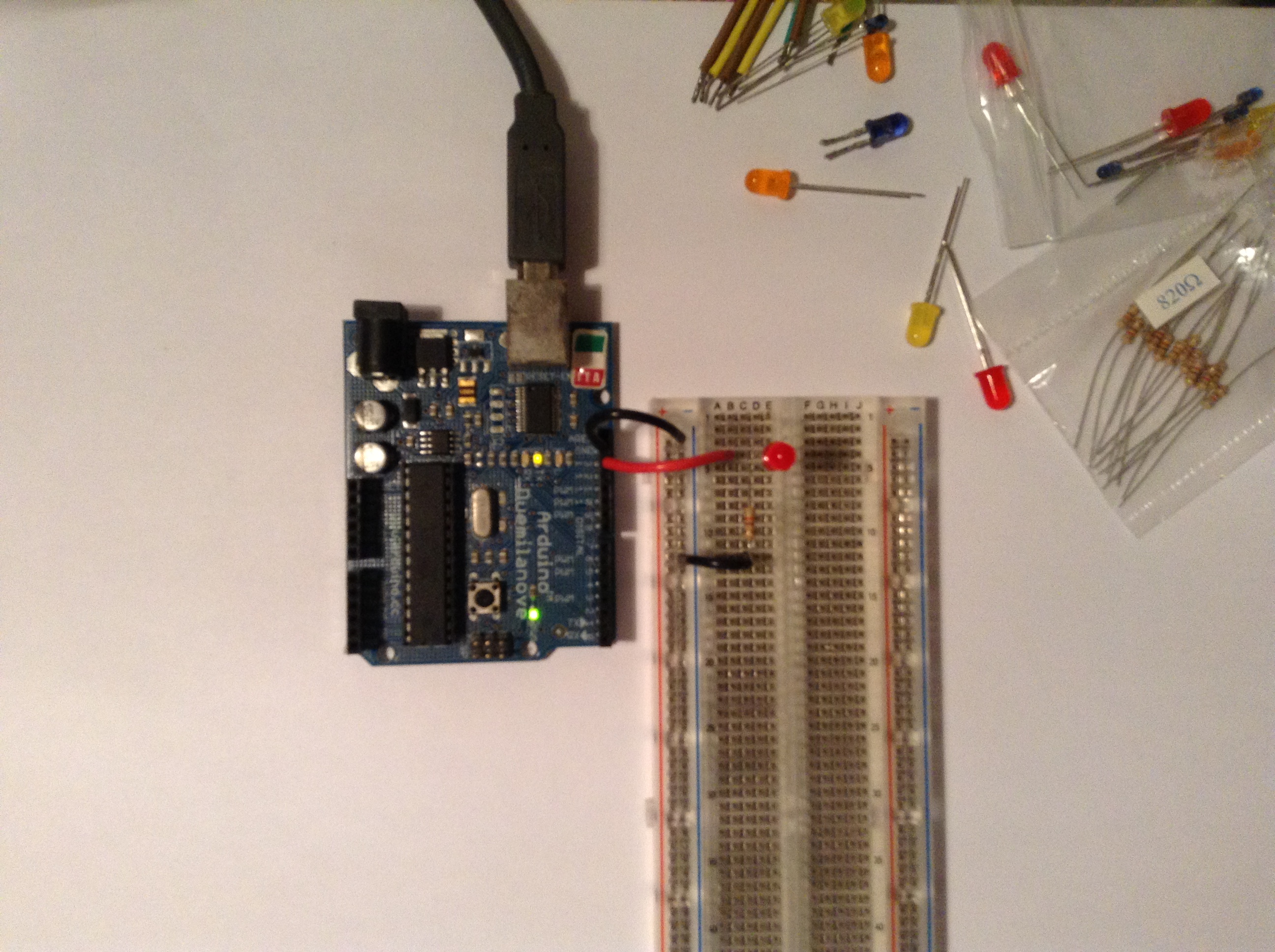 Cette étape est vraiment très simple. Il vous faut juste câbler votre LED et une résistance de 220Ω à la sortie numéro 13 de votre Arduino comme ceci (schéma venant du site Arduino.cc) :