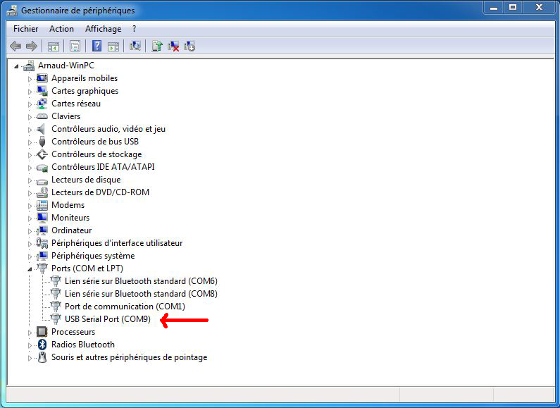 Pour connaitre le port COM de votre Arduino, tapez « Windows (touche avec le logo Windows sur votre clavier) + R » puis tapez « devmgmt.msc » et enfin cliquez sur « OK ». Vous êtes maintenant dans le gestionnaire de périphériques. Rendez-vous dans la liste « Ports (COM et LPT) » et cherchez la ligne « USB Serial Port (COMX) » où X est le numéro du port de votre Arduino.