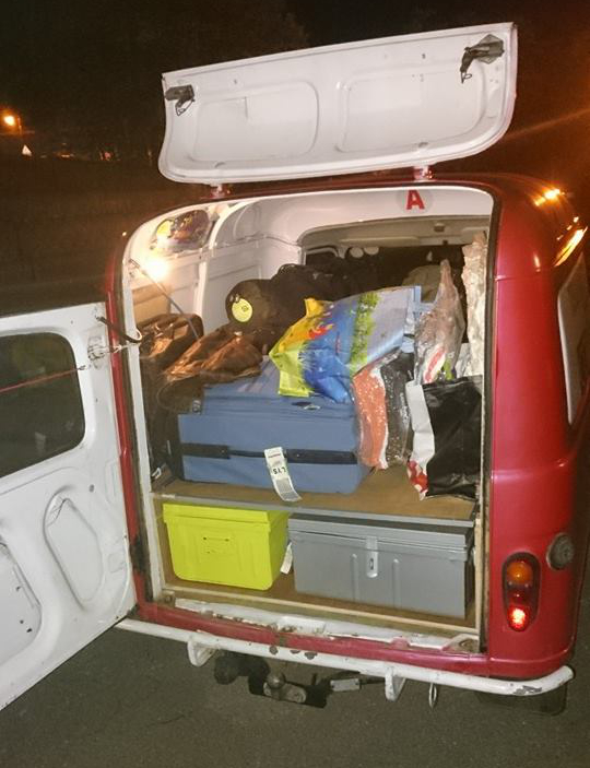 Une fois le moteur changé et l'aménagement du coffre refait (celui du 4L Trophy, bien que solide, n'était pas des plus pratique et ne permettait pas l'utilisation de la banquette arrière), il ne nous restait plus qu'à charger la 4L 😀 .